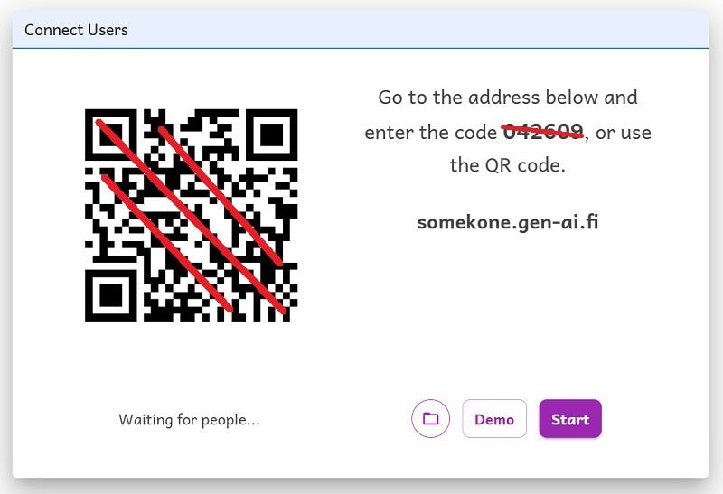 3. Students can join by scanning the QR code of your session or using the 6-digit code at somekone.gen-ai.fi. Click "Start" when all the students have joined.